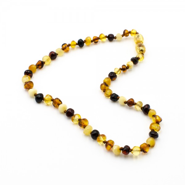 Cet ambre est de couleur cognac/cherry/miel/lemon, chaque pierre d'ambre du collier est séparée par un noeud et il possède un fermoir à vis sécurisé.