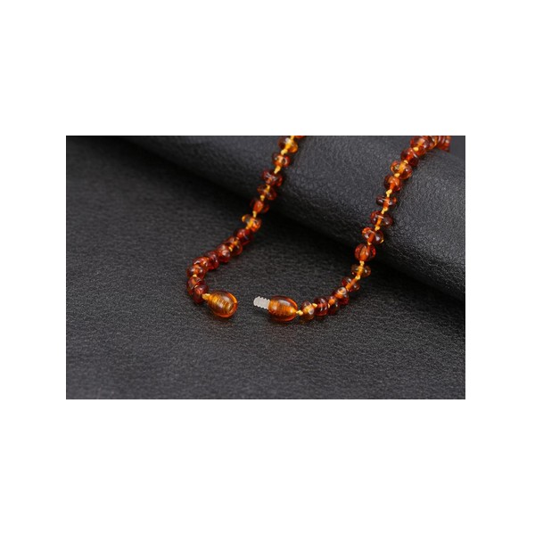 Cet ambre est de plusieurs couleurs (miel, cherry, lemon, cognac..), chaque pierre d'ambre du collier est séparée par un noeud et il possède un fermoir à vis sécurisé.